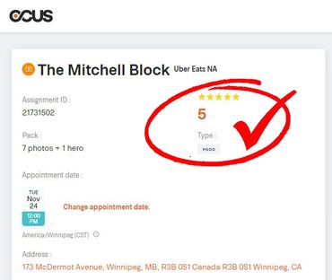 On November 24th, 2020 Wornstar Media attended to its first OCUS Photography Assignment for their client Uber Eats and one of their restaurants The Mitchell Block in Winnipeg. 35mm lens, F10, ISO 400 max, all-natural light, reflector, 45 degree default angle, earned a 5 Star Rating on this first assignment.